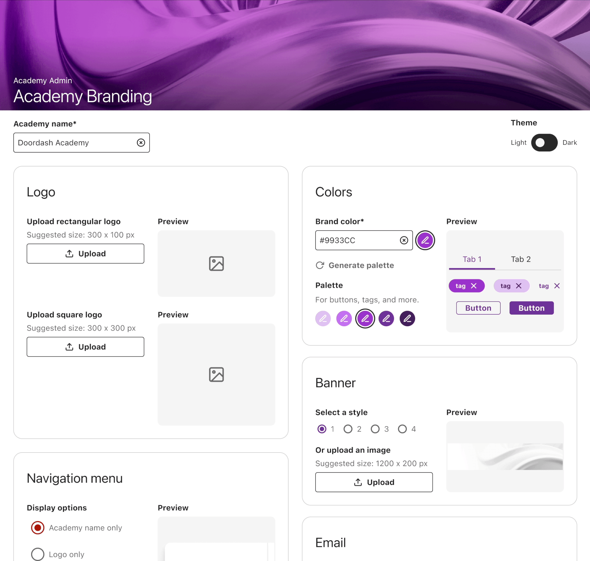 To maintain visual consistency, the email theme preview now mirrors the academy’s selected color palette, reinforcing brand identity across communications.